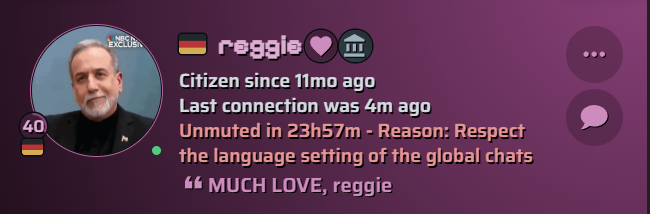 @reggie got muted for 24 hours just for typing Arabic… then used his relationship powers and got unmuted in only 10 minutes.